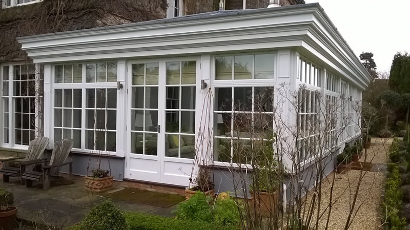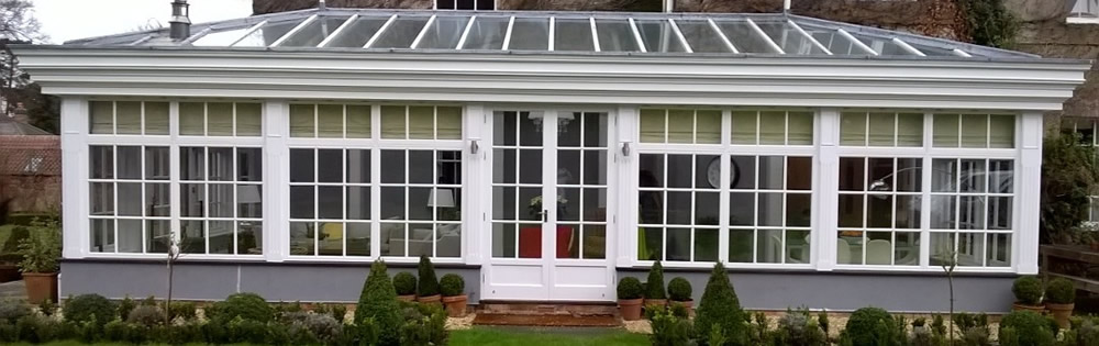 This is a conservatory in Windmerpool, steel frame clad in softwood then painted.