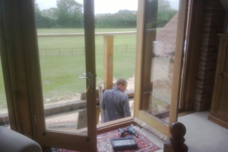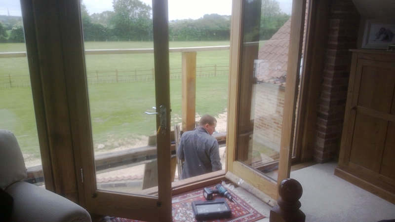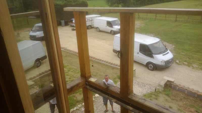 Sun balcony, construction of Romeo and Juliet balcony and view out of bedroom to unfinished Romeo and Juliet balcony. - A sun balcony, Old wood Skellingthorpe made on site from green oak.